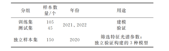 高光谱反射率的测定时间与植株含水量一致;即在苗期、块茎形成期、块茎膨大期、淀粉积累期和收获期各取一次样,随机选取八个点进行测定,每个点测定5个数据。高光谱数据的采集使用便携式,该仪器的光谱范围337~2521nm。在数据处理过程中,为了保证模型对马铃薯整个生育期的普适性,选择2020年全生育时期不同灌溉处理的试验数据筛选表征叶片含水量的特征光谱参数(波段、一阶导数、指数),以2021年—2022年块茎形成期不同灌溉处理下得到的试验数据建立该生育时期叶片含水量的监测模型。采用独立验证样本,将其实测值与模型预测值进行回归拟合,以验证模决定系数(R2)和均方根误差(RMSE)作为指标评价模型的预测能力和迁移性;综合建模和验证模精度检验结果,选择推荐最优估算模型。共提取300组高光谱数据以及与之对应的300个马铃薯冠层叶片含水量数据,将数据集以7:3比例划分为训练集和测试集,具体的样本划分结果如表1所示。