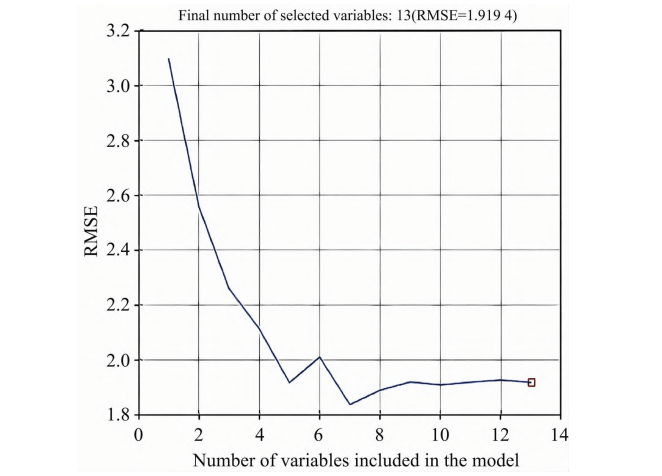 采用连续投影算法(SPA)对马铃薯冠层光谱反射率的原始波段进行筛选,得到均方根误差(RMSE)和叶片含水量的敏感波段选定数量,如图1所示。