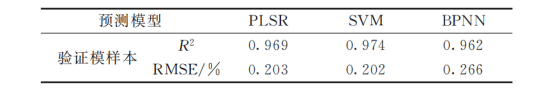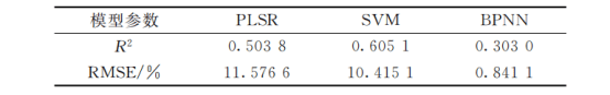 三种模型的预测结果比较如表2所示。由模型参数的比较结果,BP神经网络模型预测效果最佳,其次为支持向量机,而偏最小二乘回归模型的预测精度最低。