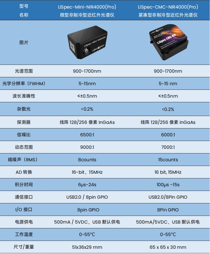 LiSpec-NIR 系列非制冷型近红外光谱仪是莱森光学(LiSen Optics)红外光谱仪系列中最新的明星 产品。该系列红外光谱仪采用 128/256 像元 InGaAs 探测器,灵敏度信噪比高。同时 LiSpec-NIR 系列非 制冷型近红外光谱仪采用了独有的大数值孔径光学平台设计、独有降噪低噪声电路控制技术,极大的提高 了光谱仪测试的动态范围。
