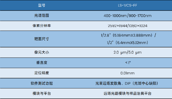LS-VCS-FF 激光远场测量系统由莱森光学专门针对 VCSEL 远场测试研发,可测量光束远场发散角和 光斑能量空间分布,进而计算光斑准直度和对称度,可测量光斑在不同距离的能量密度,用于激光安全性 评价。