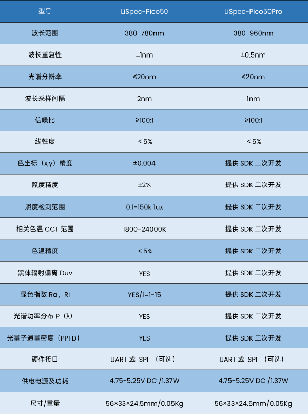 LiSpec-Pico50光谱传感器是莱森光学(LiSen Optics)光谱仪系列中一款明星产品,其体积小巧、性能卓越、成本低;灵敏度高、可靠性稳定性好,十分便于集成,使用灵活,支持二次开发,适合在线/移动/便携等多种场景。LiSpec-Pico50不仅具备强大的在线检测能力,还拥有出色的环境适应性,可以广泛应用于各种环境和场景中。适用于专业灯或光源的光品质参数测量和光色检测、辅助校正,照明工程标准照度测量等场景。在保证高精度色度测量性能的同时,体积小、重量轻、方便携带,适用于各种场景,并能够满足不同领域的需求。